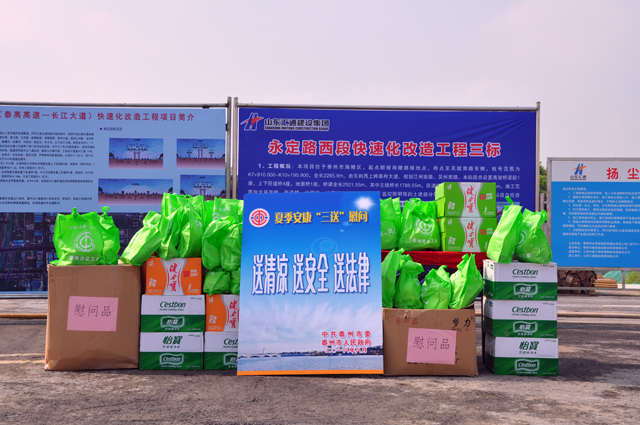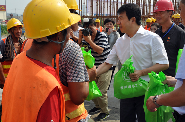 ??? 8月7日上午,泰州市委副書記、市長史立軍一行到六分公司承建的泰州永定路項目部開展送清涼、送安全、送法律“三送”活動,為大家帶來了防暑降溫物品、慰問金。