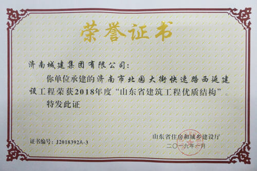 濟南市北園大街快速路西延建設工程被評為2018年度“山東省建筑工程優質結構”