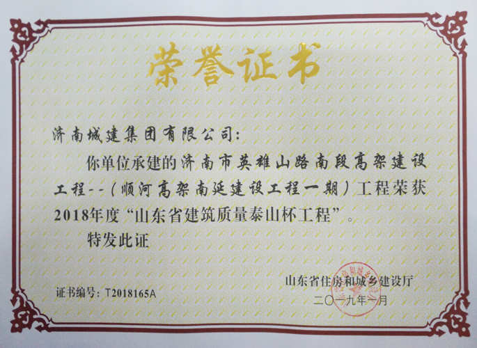 濟南市英雄山路南段高架建設工程(順河高架南延建設工程一期)工程被評為2018年度“山東省建筑質量泰山杯工程”