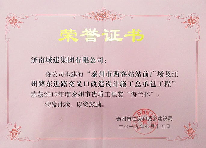 泰州市西客站站前廣場(chǎng)及江州東進(jìn)路交叉口改造設(shè)計(jì)施工總承包工程被評(píng)為2019年度泰州市優(yōu)質(zhì)工程獎(jiǎng)”梅蘭杯“