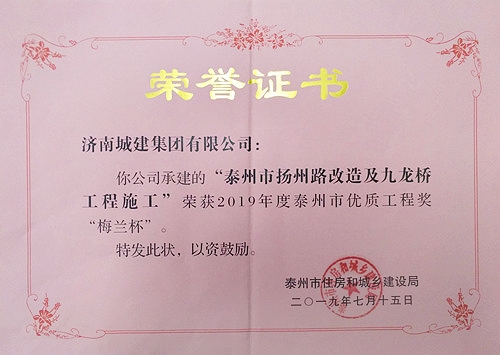 泰州市揚州路及九龍橋工程施工被評為2019年度泰州市優質工程獎”梅蘭杯“