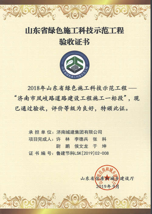 濟南市鳳歧路道路建設工程施工一標段被評為2018年山東省綠色施工科技示范工程