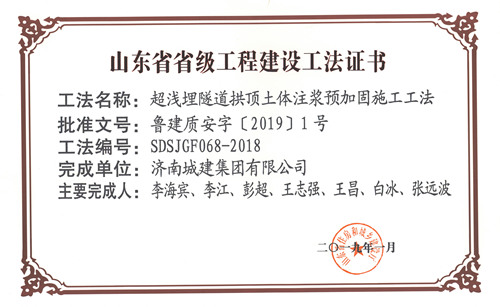 集團“超淺埋隧道拱頂土體注漿預加固施工工法”被評為山東省省級工程建設工法