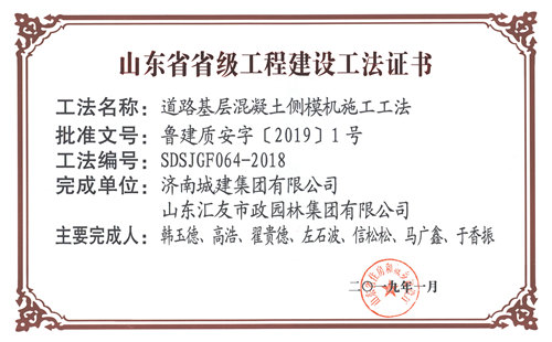 集團(tuán)“道路基層混凝土側(cè)模機(jī)施工工法”被評(píng)為山東省省級(jí)工程建設(shè)工法