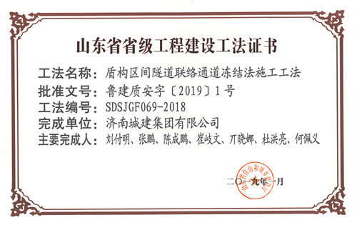 集團(tuán)“盾構(gòu)區(qū)間隧道聯(lián)絡(luò)通道凍結(jié)法施工工法”被評(píng)為山東省省級(jí)工程建設(shè)工法