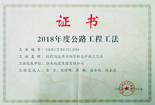 集團“暗挖隧道薄壁鋼管砼支護施工工法”被評為2018年度公路工程工法