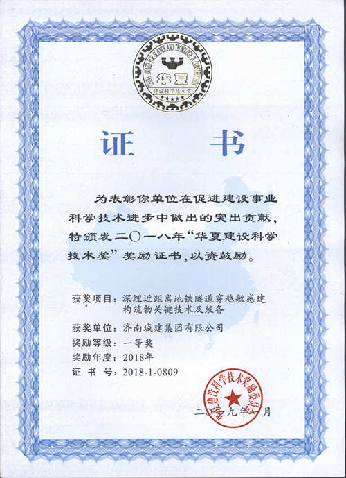 集團《深埋近距離地鐵隧道穿越敏感建構物關鍵技術及裝備》榮獲華夏建設科學技術獎一等獎