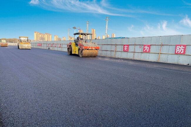 濟南市春博路南延項目完成科新路粗粒瀝青攤鋪